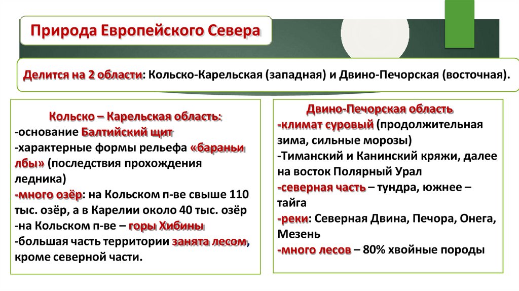 Природа Европейского СевераДелится на 2 области: Кольско-Карельская (западная) и Двино-Печорская (восточная).