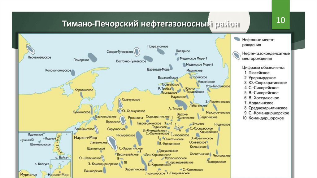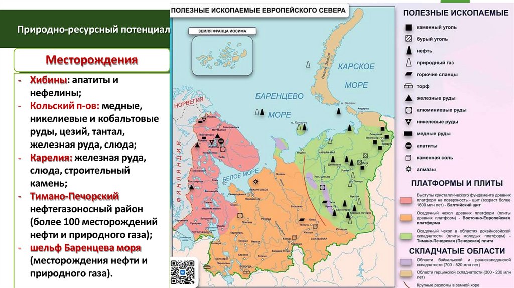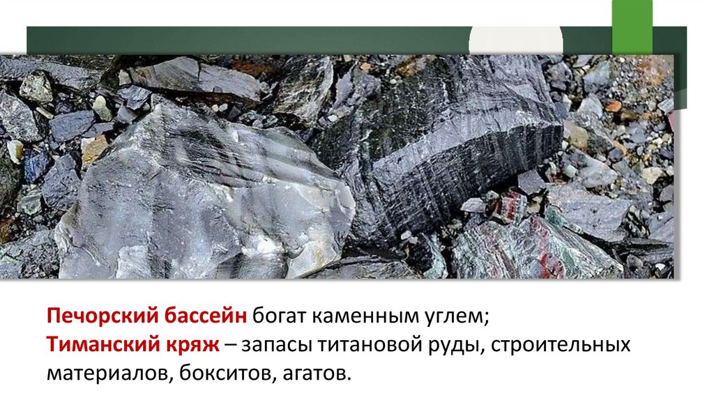 Печорский бассейн богат каменным углем;Тиманский кряж – запасы титановой руды, строительных
