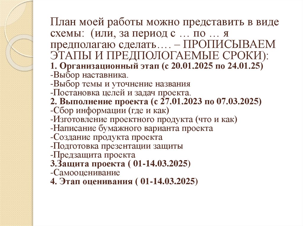 План моей работы можно представить в видесхемы: (или, за период с … по … я