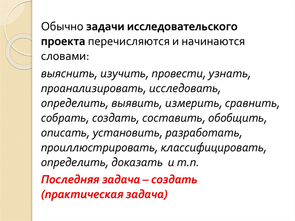 Обычно задачи исследовательскогопроекта перечисляются и начинаются