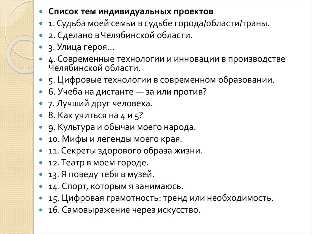 Список тем индивидуальных проектов1. Судьба моей семьи в судьбе города/области/траны.