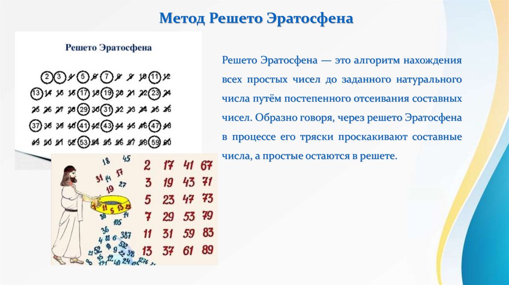 Метод Решето ЭратосфенаРешето Эратосфена — это алгоритм нахождения