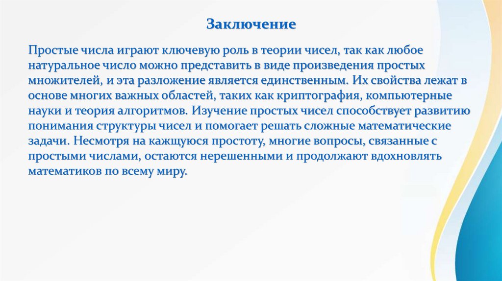 ЗаключениеПростые числа играют ключевую роль в теории чисел, так как любое
