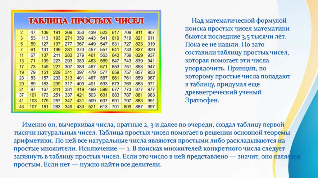 Именно он, вычеркивая числа, кратные 2, 3 и далее по очереди, создал таблицу первой