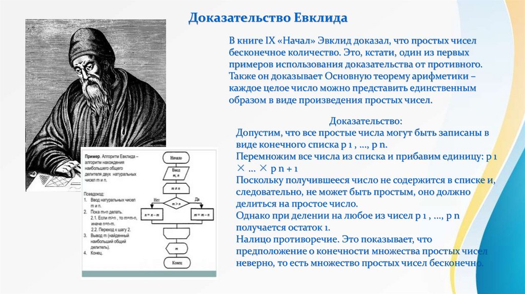 Доказательство ЕвклидаВ книге IX «Начал» Эвклид доказал, что простых чисел