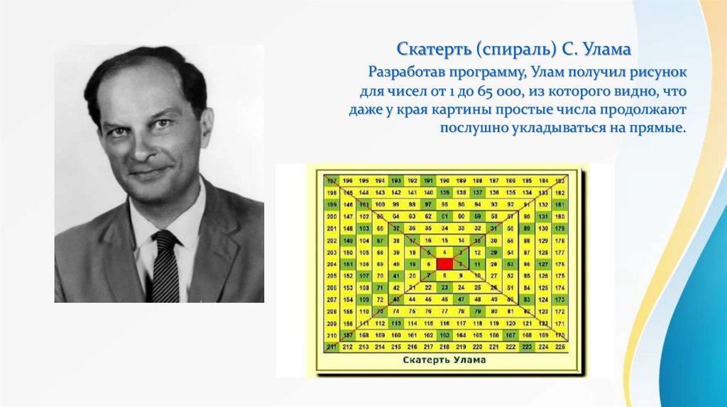 Скатерть (спираль) С. УламаРазработав программу, Улам получил рисунок