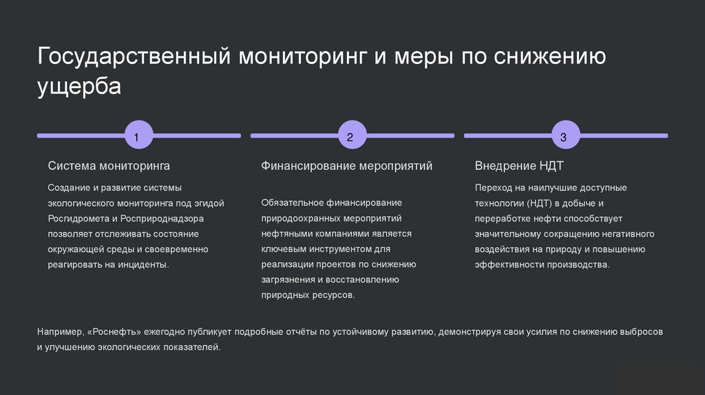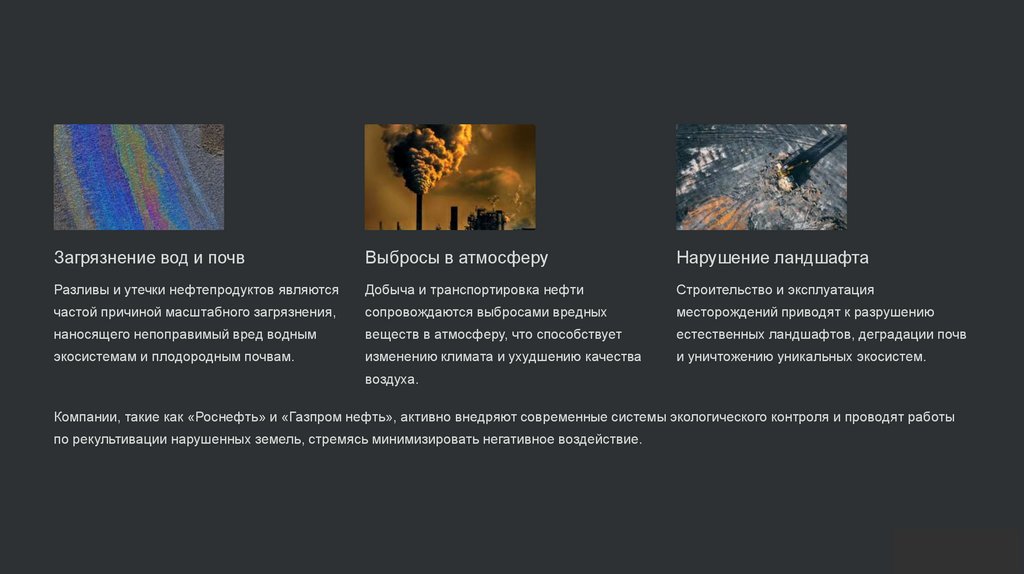 Компании, такие как «Роснефть» и «Газпром нефть», активно внедряют современные системы экологического контроля и проводят работы