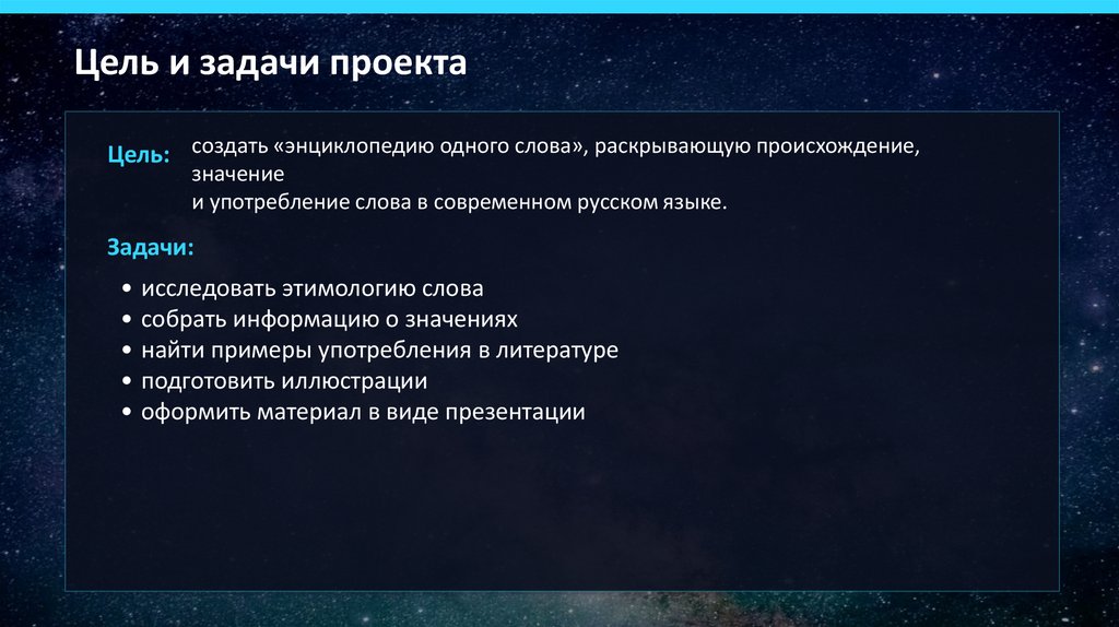 Цель и задачи проектаЦель: создать «энциклопедию одного слова», раскрывающую происхождение,