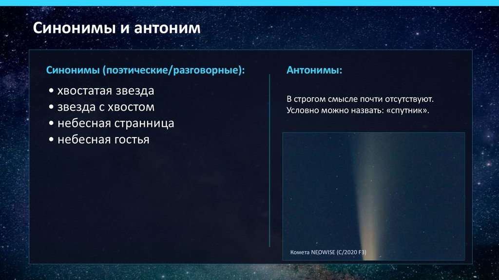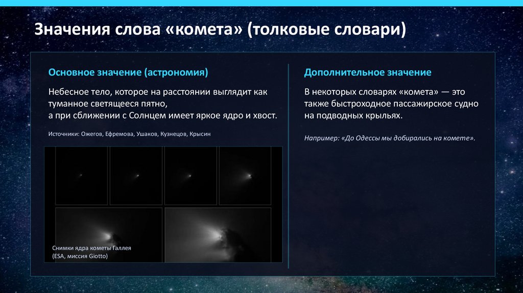 Значения слова «комета» (толковые словари)Основное значение (астрономия)