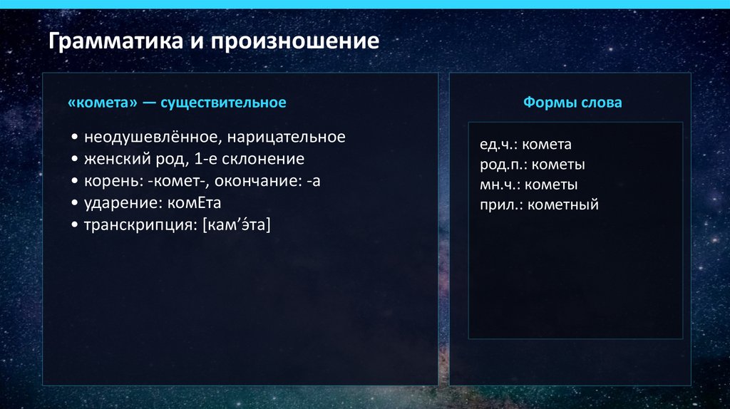 Грамматика и произношение«комета» — существительное