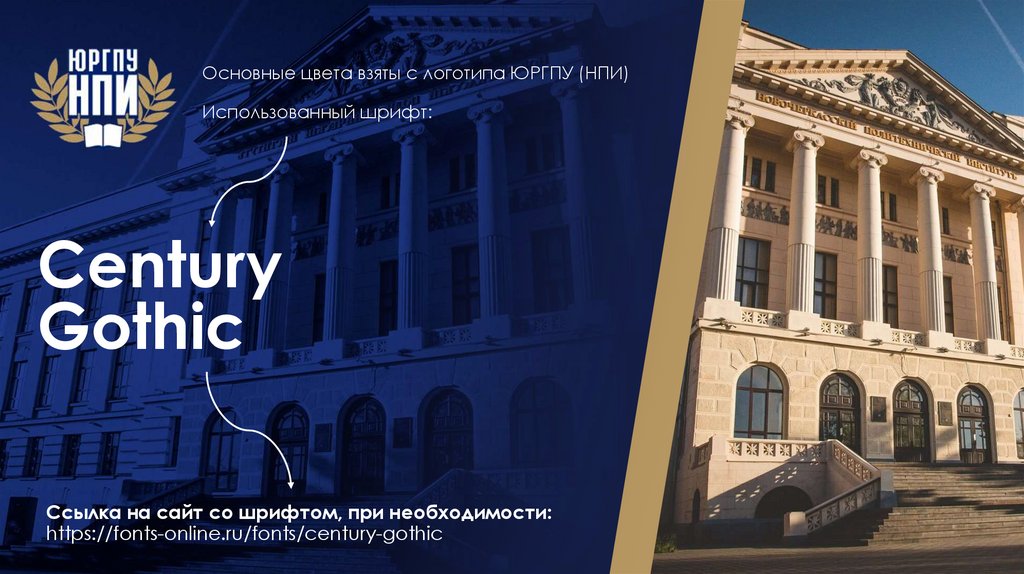 Основные цвета взяты с логотипа ЮРГПУ (НПИ)Использованный шрифт: