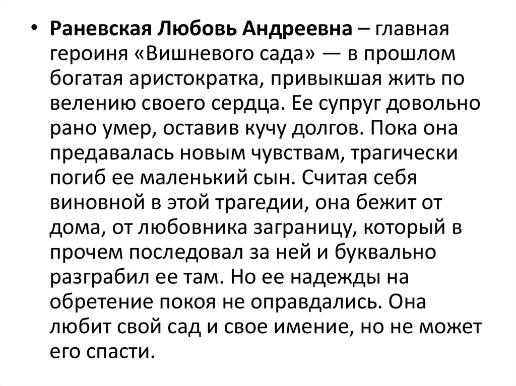 • Раневская Любовь Андреевна – главнаягероиня «Вишневого сада» — в прошлом