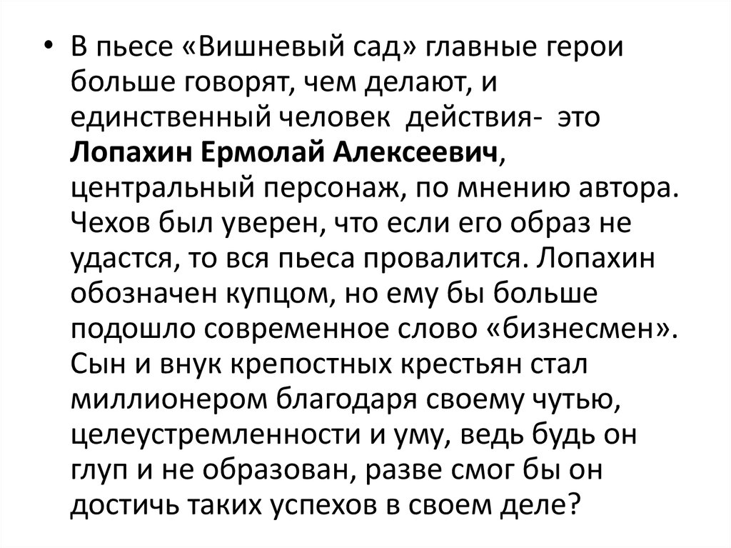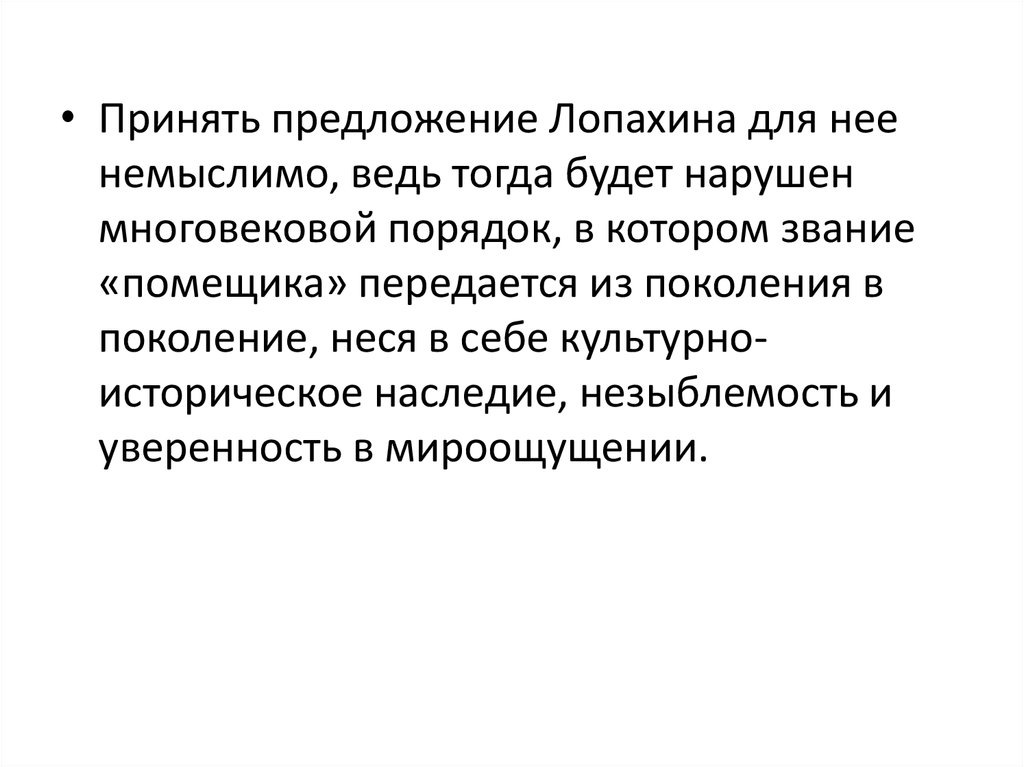 • Принять предложение Лопахина для неенемыслимо, ведь тогда будет нарушен