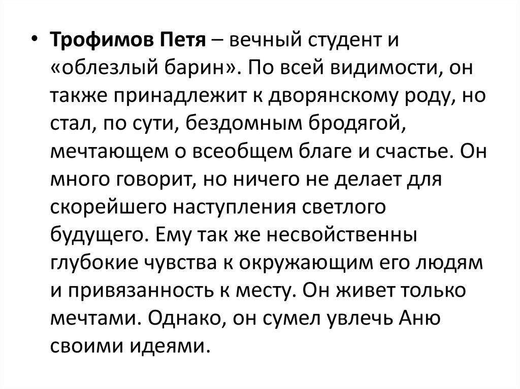 • Трофимов Петя – вечный студент и«облезлый барин». По всей видимости, он