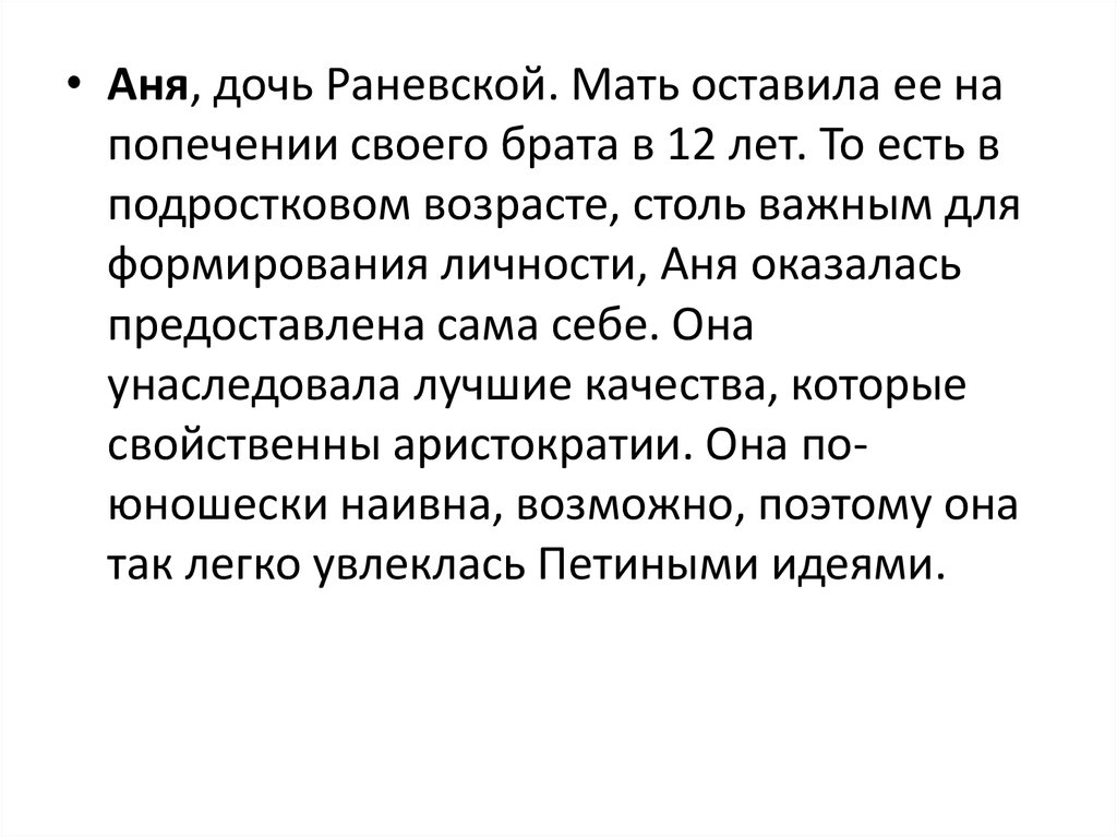• Аня, дочь Раневской. Мать оставила ее напопечении своего брата в 12 лет. То есть в