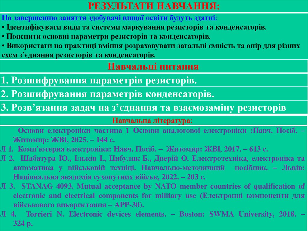 • Ідентифікувати види та системи маркування резисторів та конденсаторів.