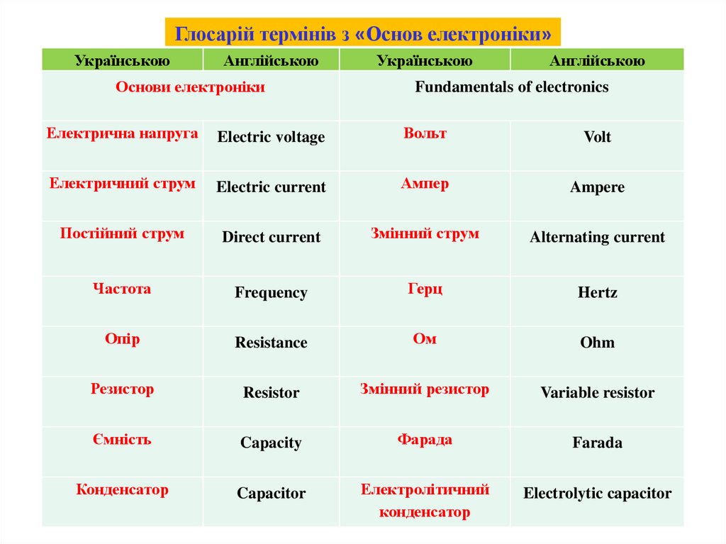 Глосарій термінів з «Основ електроніки»Українською