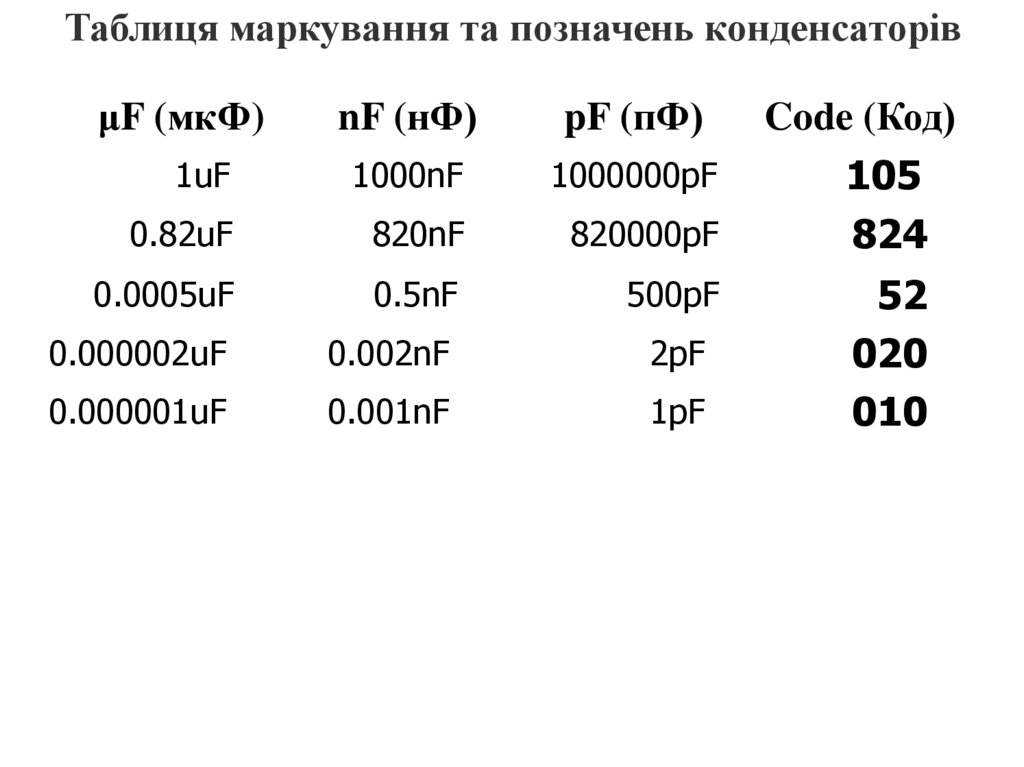 - ємність (пФ, нФ, мкФ);