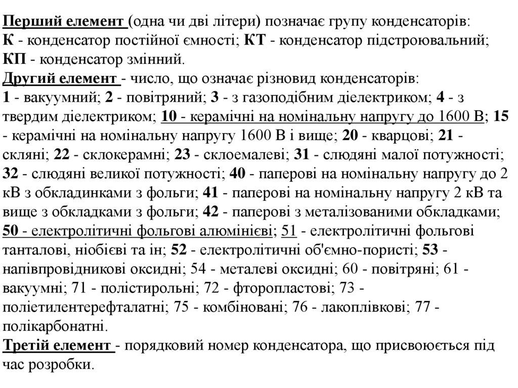 танталові, ніобієві та ін; 52 - електролітичні об'ємно-пористі; 53 напівпровідникові оксидні; 54 - металеві оксидні; 60 - повітряні; 61 вакуумні; 71 - полістирольні; 72 - фторопластові; 73 поліетилентерефталатні; 75 - комбіновані; 76 - лакоплівкові; 77 полікарбонатні.