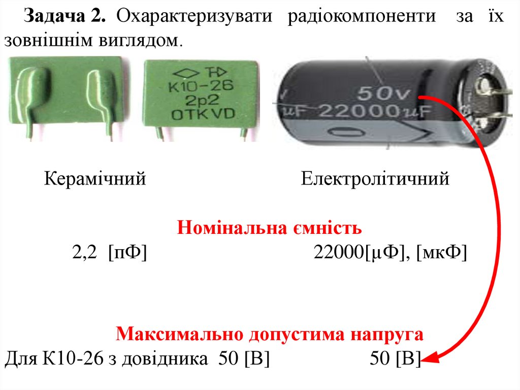 Задача 5. Розшифрувати маркування радіокомпонентів.К75–10–250 В–1,0 мкФ 5% – В