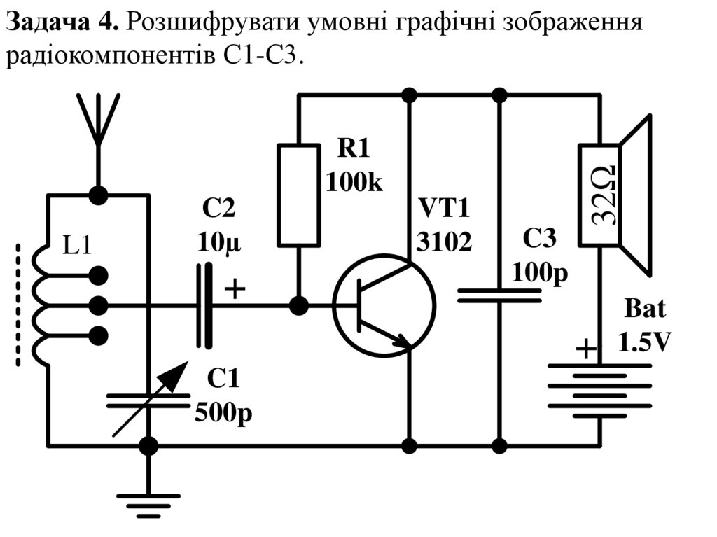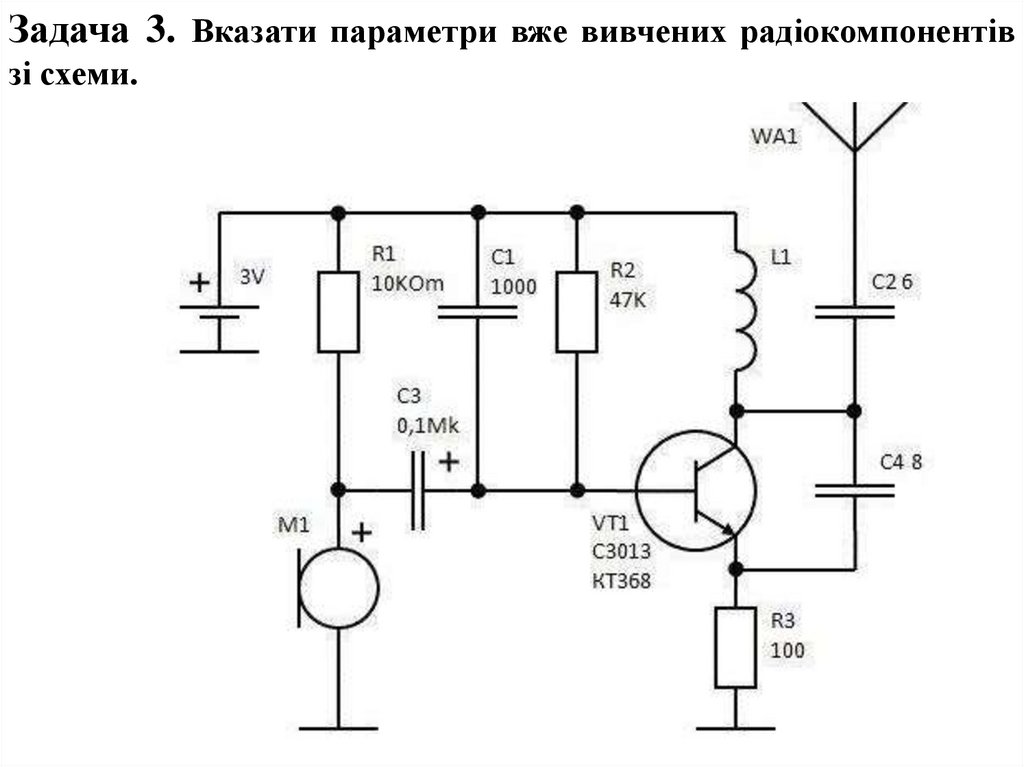 Задача 3. Вказати параметри вже вивчених радіокомпонентівзі схеми.