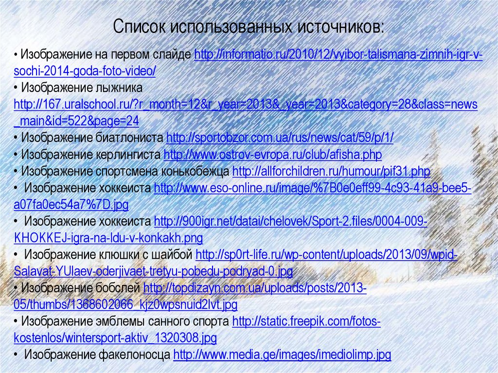 Список использованных источников:• Изображение на первом слайде http://informatio.ru/2010/12/vyibor-talismana-zimnih-igr-v-