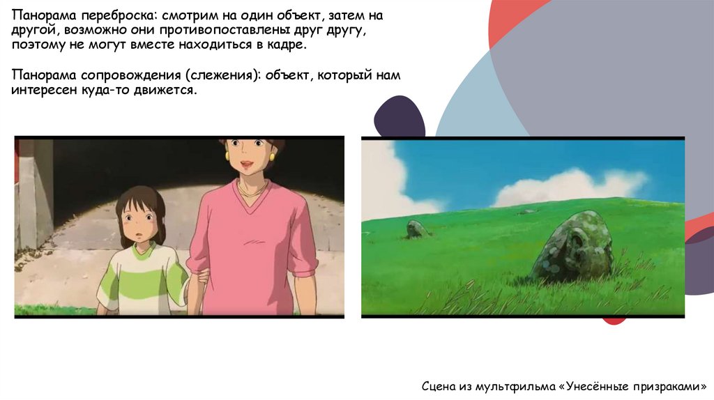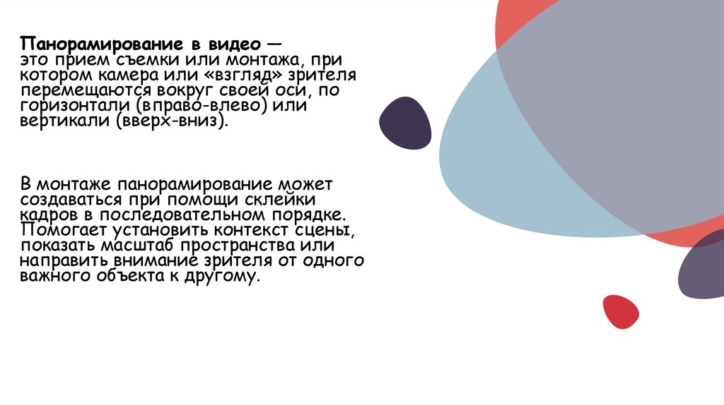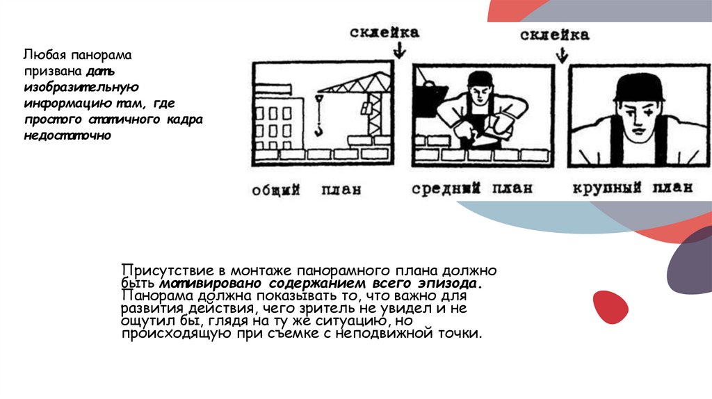 Сцена, содержащая в себе панораму сама по себе являетсямонтажной фразой. Она имитирует взгляд, переводящий внимание