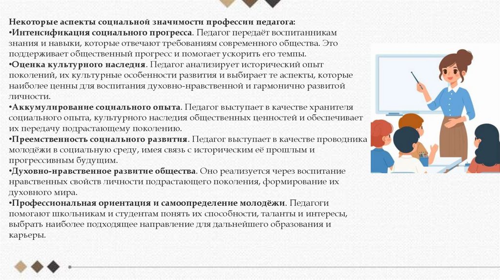 Некоторые аспекты социальной значимости профессии педагога:•Интенсификация социального прогресса. Педагог передаёт воспитанникам