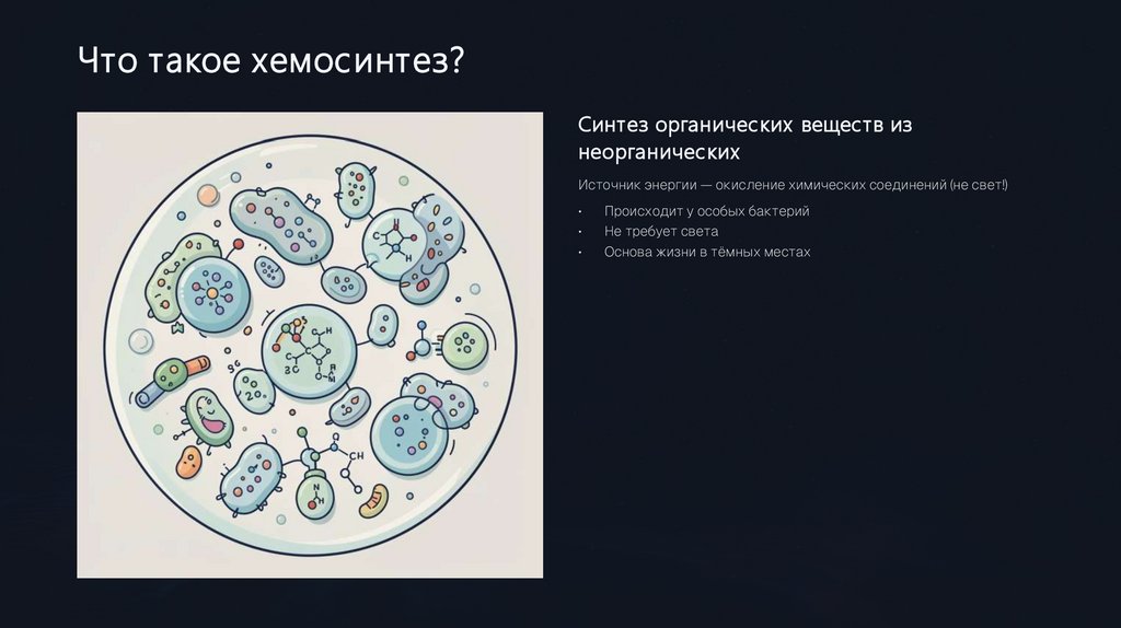 Что такое хемосинтез?Синтез органических веществ из