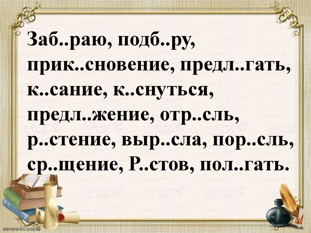 Заб..раю, подб..ру,прик..сновение, предл..гать,