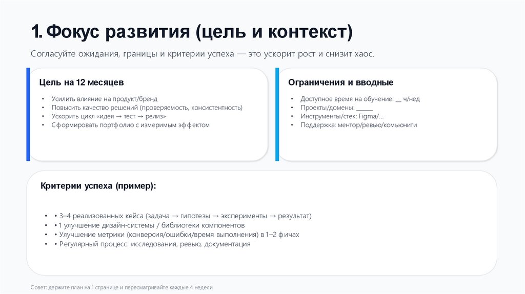1. Фокус развития (цель и контекст)Согласуйте ожидания, границы и критерии успеха — это ускорит рост и снизит хаос.
