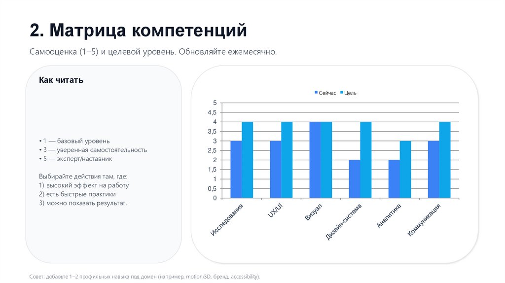 2. Матрица компетенцийСамооценка (1 –5) и целевой уровень. Обновляйте ежемесячно.