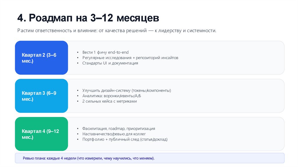 4. Роадмап на 3–12 месяцевРастим ответственность и влияние: от качества решений — к лидерству и системности.