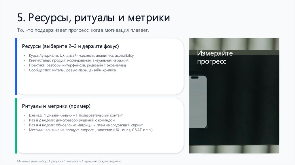 5. Ресурсы, ритуалы и метрикиТо, что поддерживает прогресс, когда мотивация плавает.