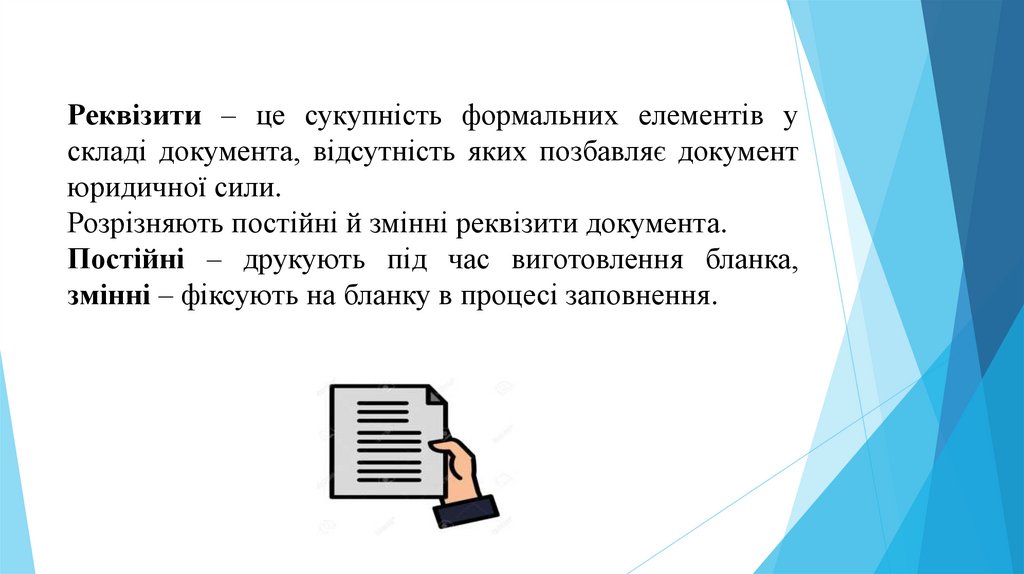 Реквізити – це сукупність формальних елементів ускладі документа, відсутність яких позбавляє документ