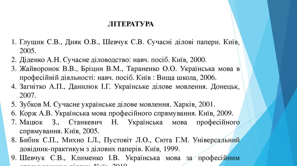 ЛІТЕРАТУРА1. Глущик С.В., Дияк О.В., Шевчук С.В. Сучасні ділові папери. Київ,