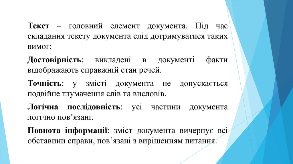 Текст – головний елемент документа. Під часскладання тексту документа слід дотримуватися таких