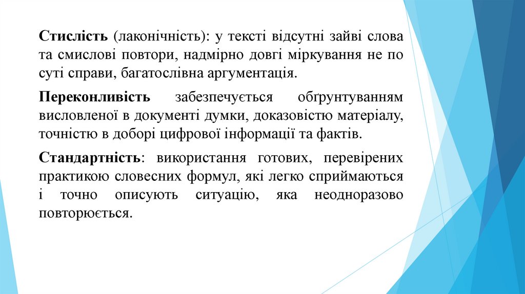 Стислість (лаконічність): у тексті відсутні зайві словата смислові повтори, надмірно довгі міркування не по