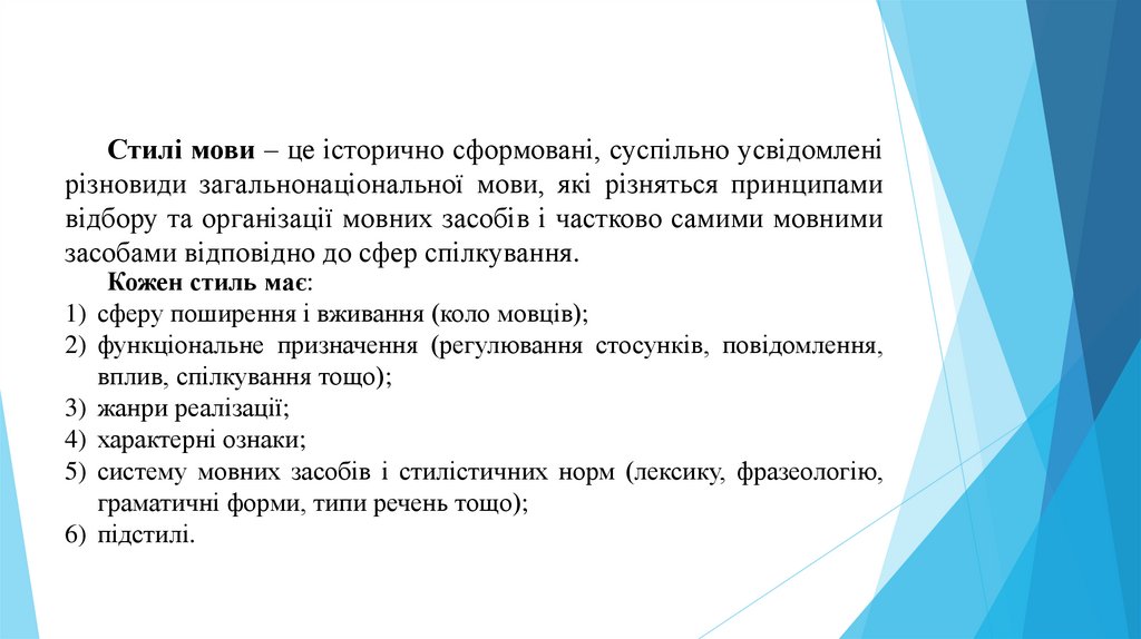 Стилі мови – це історично сформовані, суспільно усвідомленірізновиди загальнонаціональної мови, які різняться принципами