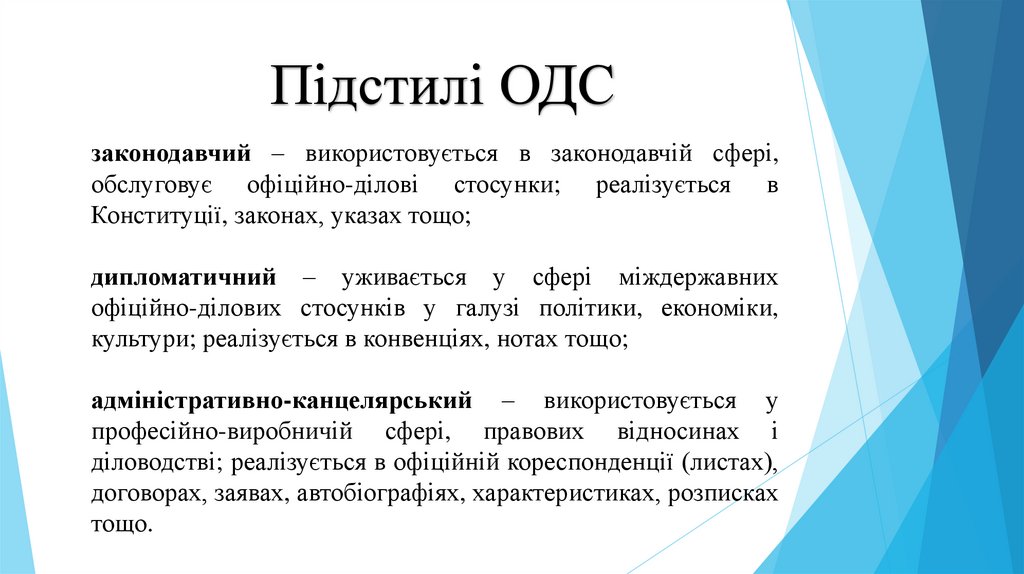 Підстилі ОДСзаконодавчий – використовується в законодавчій сфері,