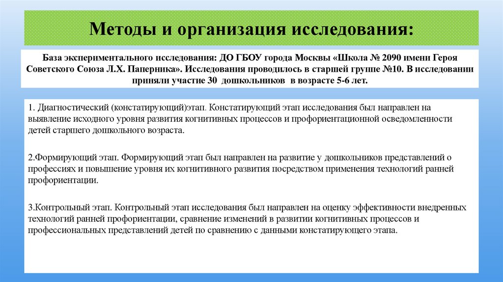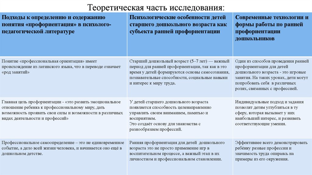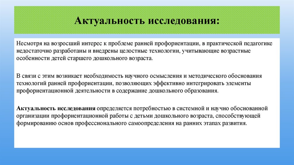Актуальность исследования:Несмотря на возросший интерес к проблеме ранней профориентации, в практической педагогике
