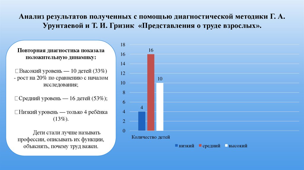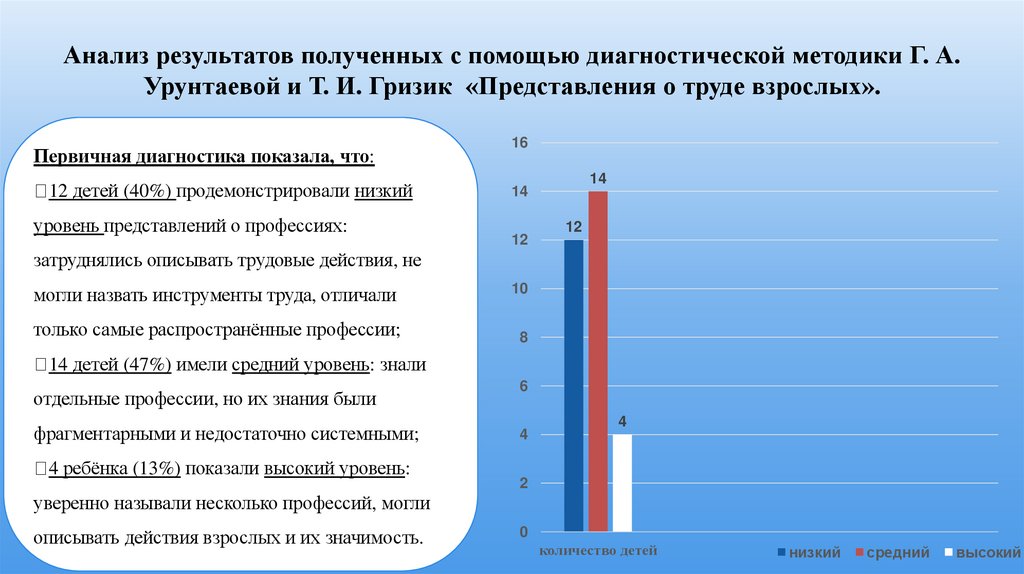 диагностики использовались: методика Г. А. Урунтаевой и Т. И. Гризик «Представления о труде взрослых»;