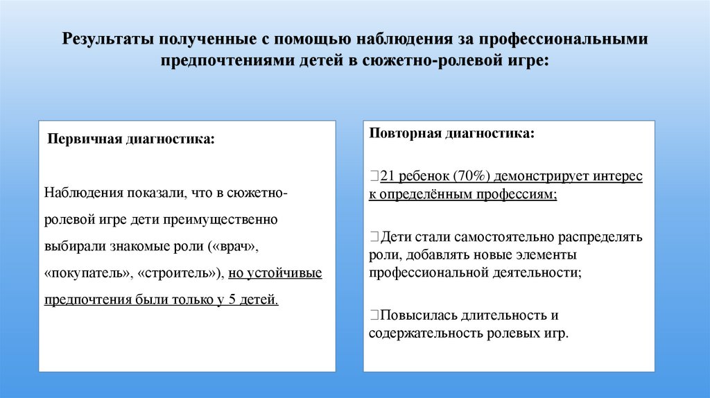 Результаты полученные с помощью наблюдения за профессиональнымипредпочтениями детей в сюжетно-ролевой игре: