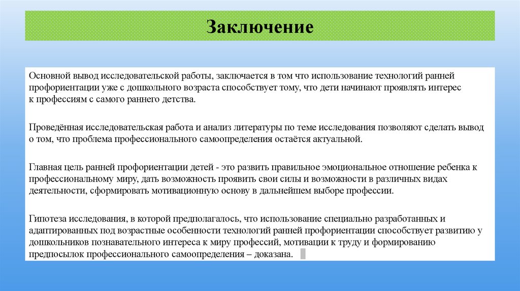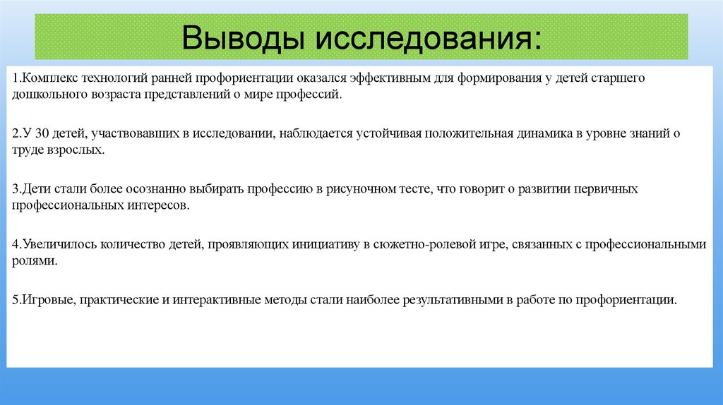 Выводы исследования:1.Комплекс технологий ранней профориентации оказался эффективным для формирования у детей старшего