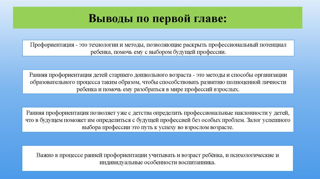 Выводы по второй главе:Важнейшим результатом ранней профориентации является формирование у детей качества социальной