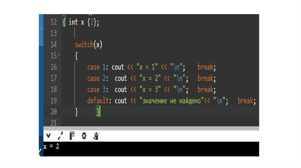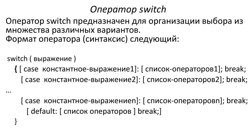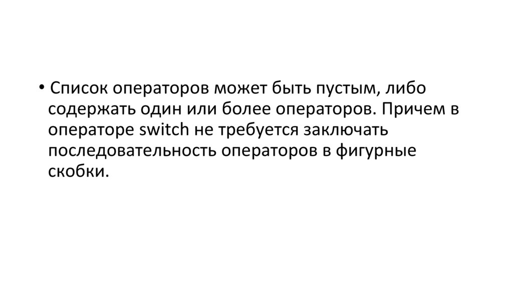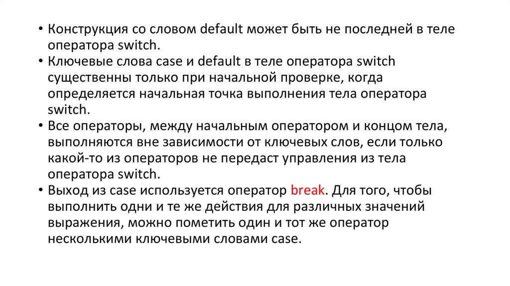 • Конструкция со словом default может быть не последней в телеоператора switch.