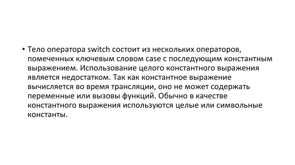 • Тело оператора switch состоит из нескольких операторов,помеченных ключевым словом case с последующим константным