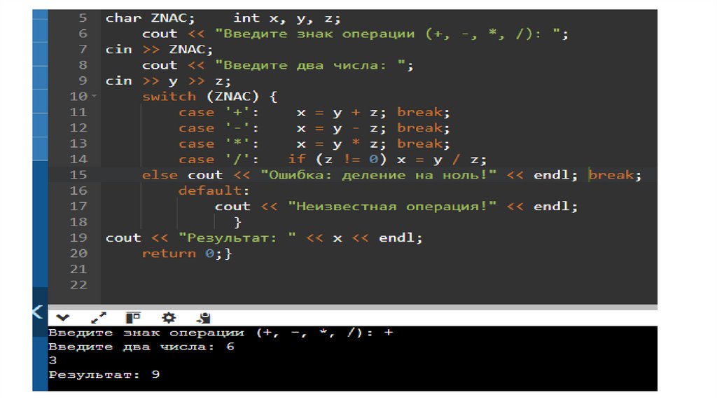 else if (ZNAC == '/') x = y / z; …