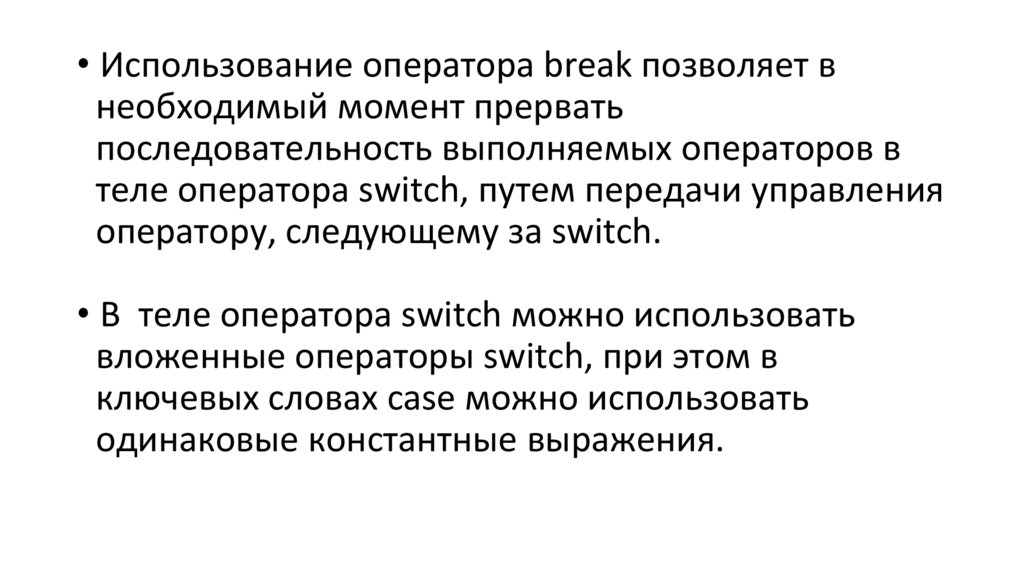 • В теле оператора switch можно использовать