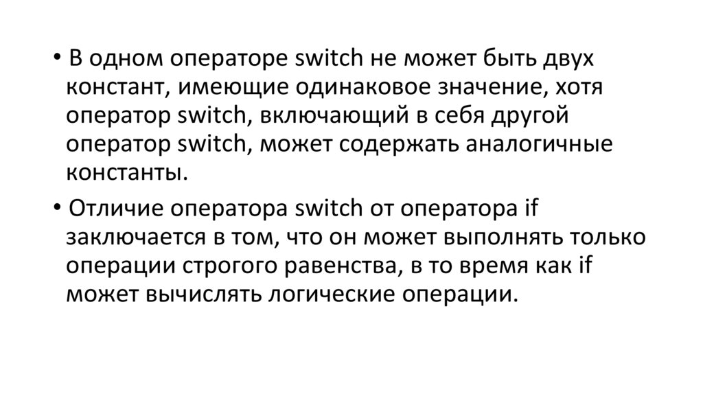 • В одном операторе switch не может быть двухконстант, имеющие одинаковое значение, хотя